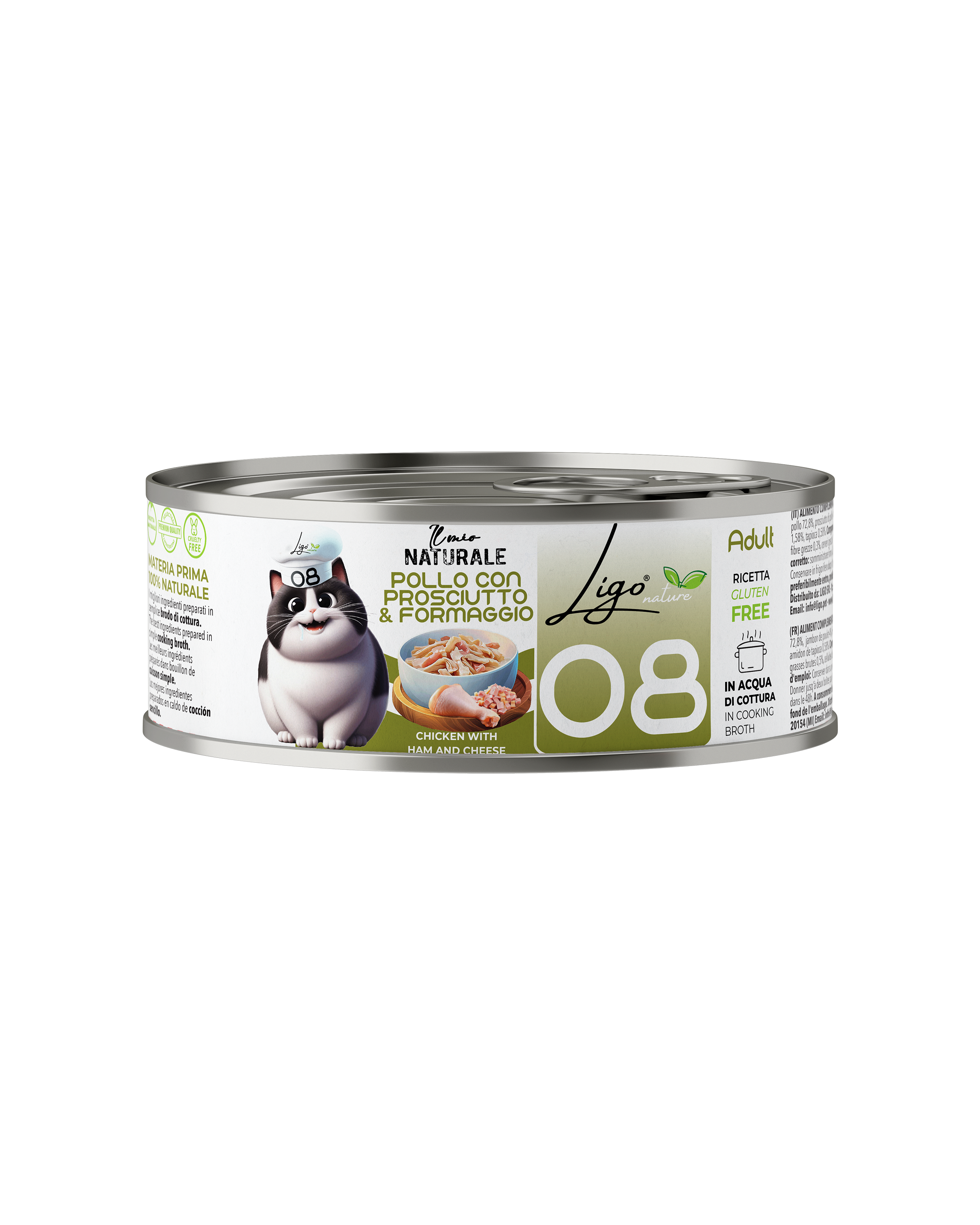 (IT) ALIMENTO COMPLEMENTARE PER GATTI ADULTI. Composizione: filetti di pollo 72,8%, prosciutto 4% – formaggio 4%, riso 3%, proteine idrolizzate 1,58%, tapioca 0,58%. Componenti analitici: proteine 17%, grassi grezzi 0,5%, fibre grezze 0,3%; ceneri grezze 1,5%, umidità 79%. Istruzioni per un uso corretto: somministrare fino a 2 lattine al giorno. Servire a temperatura ambiente. Conservare in frigorifero dopo l’apertura ed utilizzare entro 48 ore. Da consumarsi preferibilmente entro, prodotto da e nr. lotto: vedere fondo lattina.