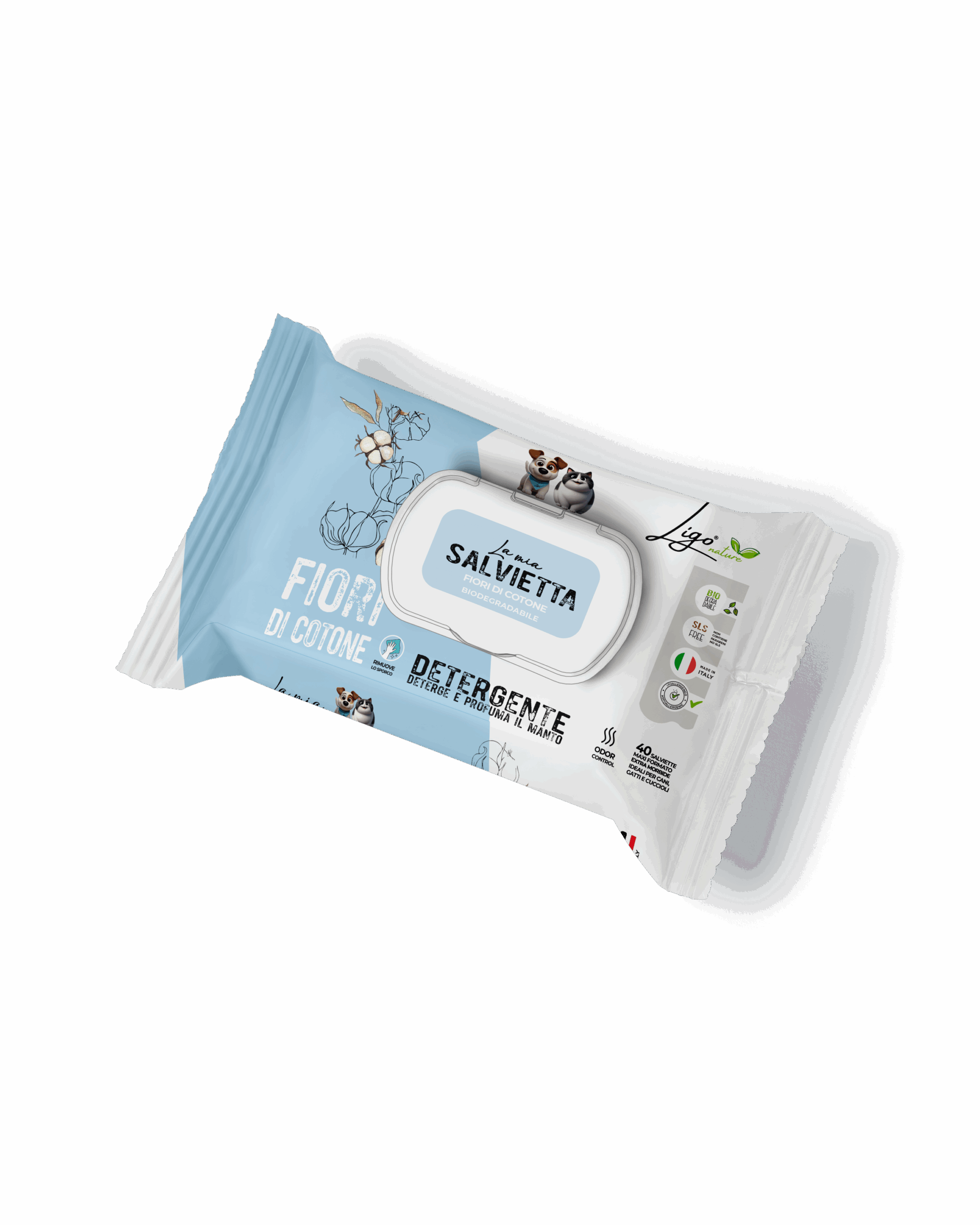 Deterge e profuma delicatamente il manto di cani e gatti grazie alla profumazione ai fiori di cotone, fresca e delicata. La formula ipoallergenica è pensata per l’uso quotidiano e lascia il pelo pulito e profumato. Senza SLS e parabeni, è confezionata in un pratico formato da 40 salviette, ideale anche fuori casa. Prodotto in Italia.
