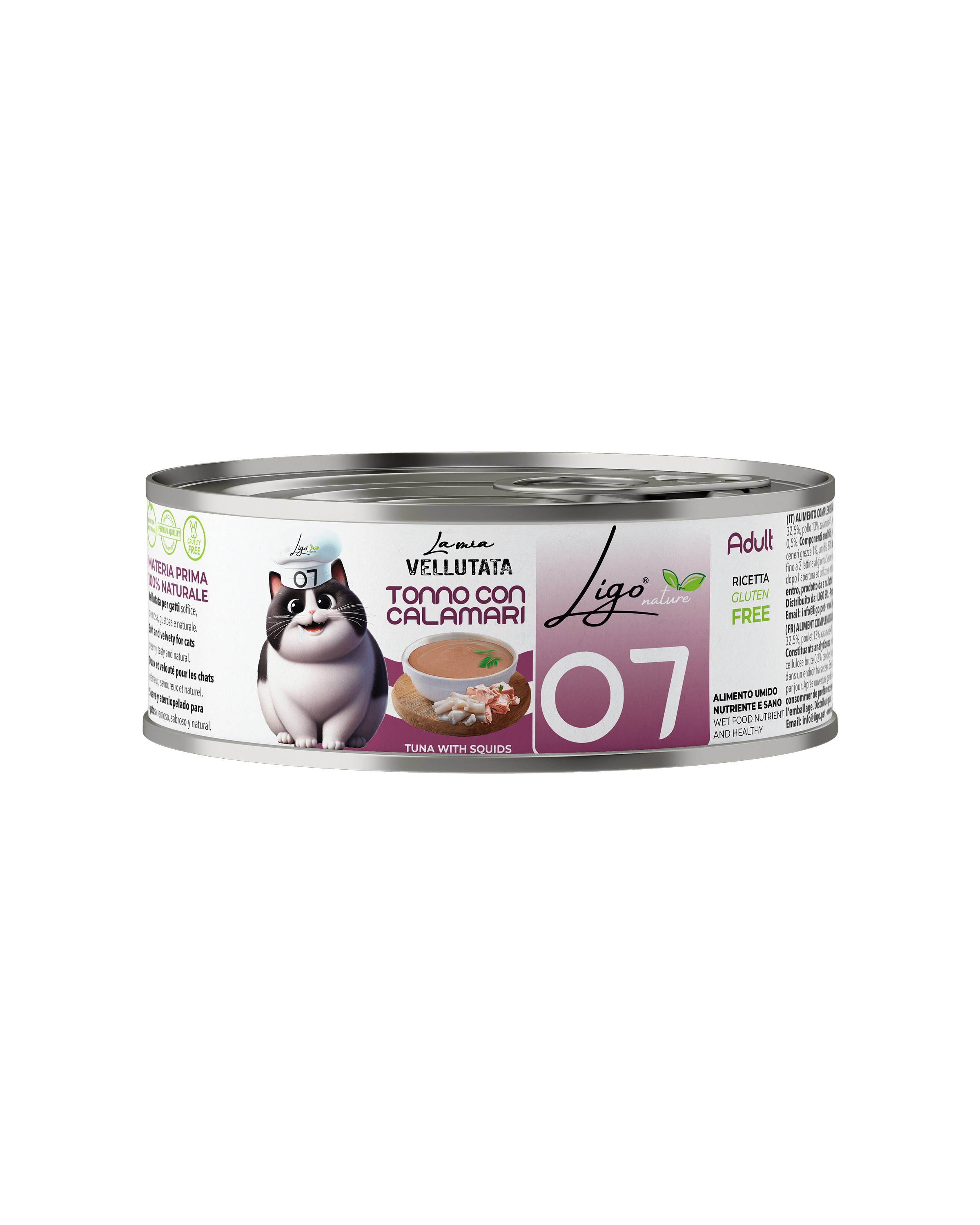 Lattina n.31 – Vellutata Tonno con Calamari Una ricetta morbida a base di tonno e calamari, pensata per gatti adulti. Consistenza vellutata e gusto delicato per una pausa leggera e nutriente.