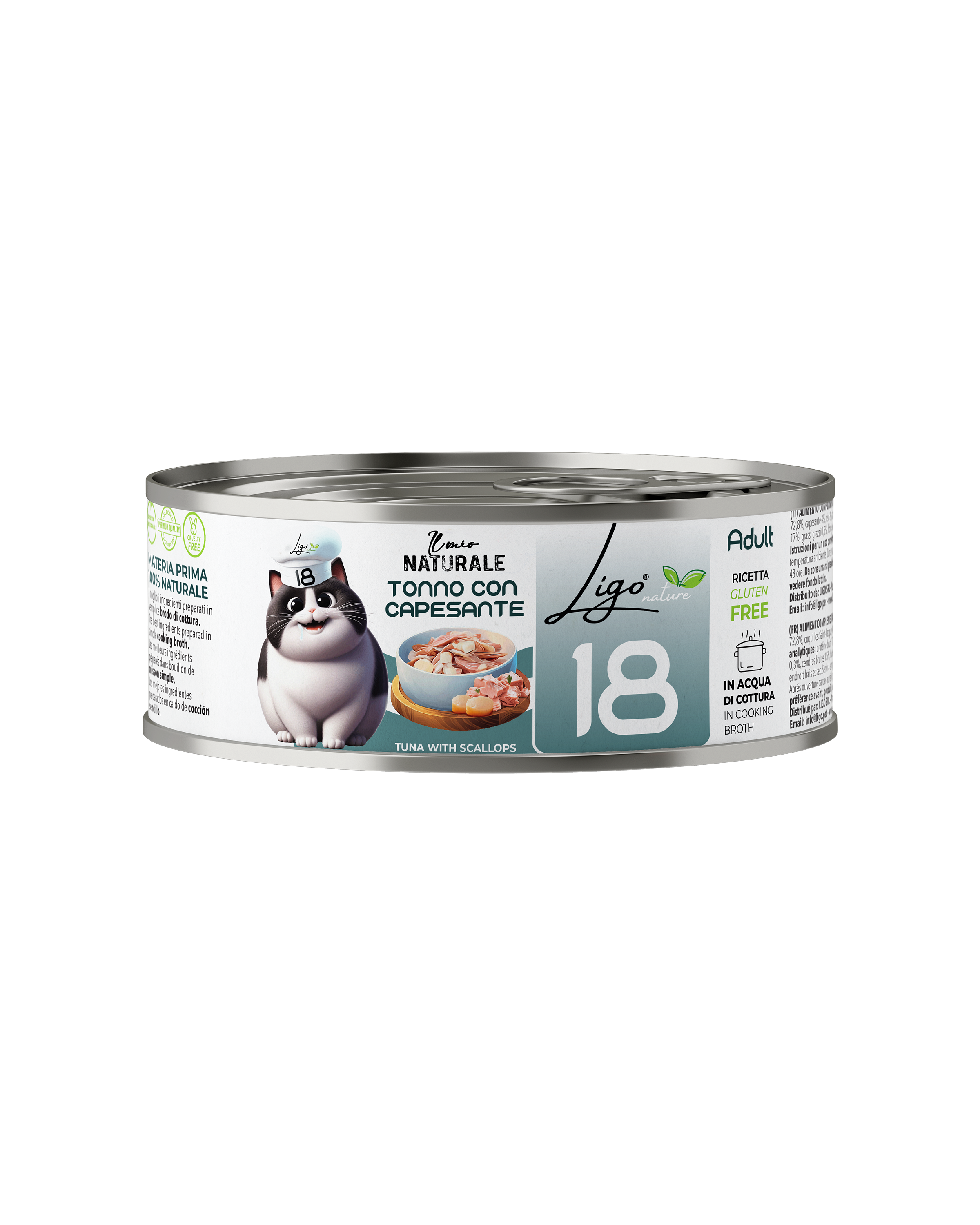 Lattina n. 18 – Tonno con Capesante Una ricetta raffinata a base di tonno e capesante, pensata per variare la dieta del gatto con un tocco speciale. Cotta in acqua di cottura, è ideale per offrire un pasto leggero e gustoso.