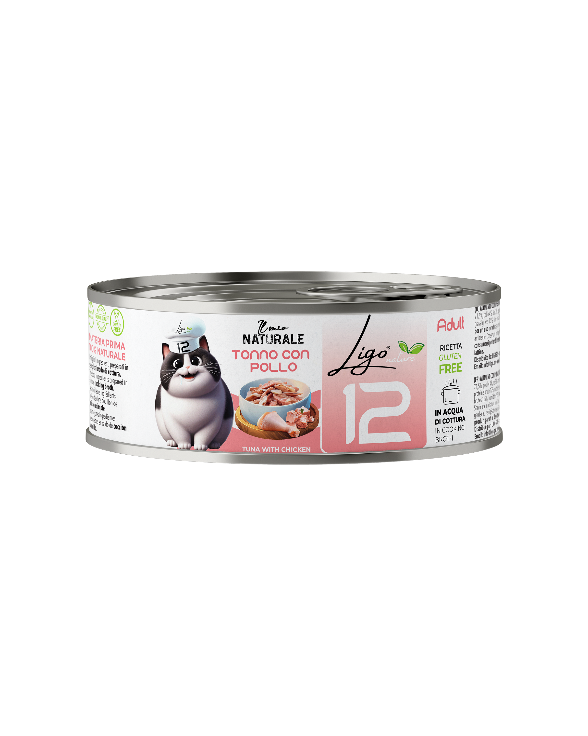 (IT) ALIMENTO COMPLEMENTARE PER GATTI ADULTI. Composizione: tonnetto 71,5%, pollo 4%, riso 3%, tapioca 0,58%. Componenti analitici: proteina 17%, grassi grezzi 0,5%, fibre grezze 0,3%; ceneri grezze 1,5%, umidità 79%. Istruzioni per un uso corretto: somministrare fino a 2 lattine al giorno. Servire a temperatura ambiente. Conservare in frigorifero dopo l’apertura ed utilizzare entro 48 ore. Da consumarsi preferibilmente entro, prodotto da e nr. lotto: vedere fondo lattina.