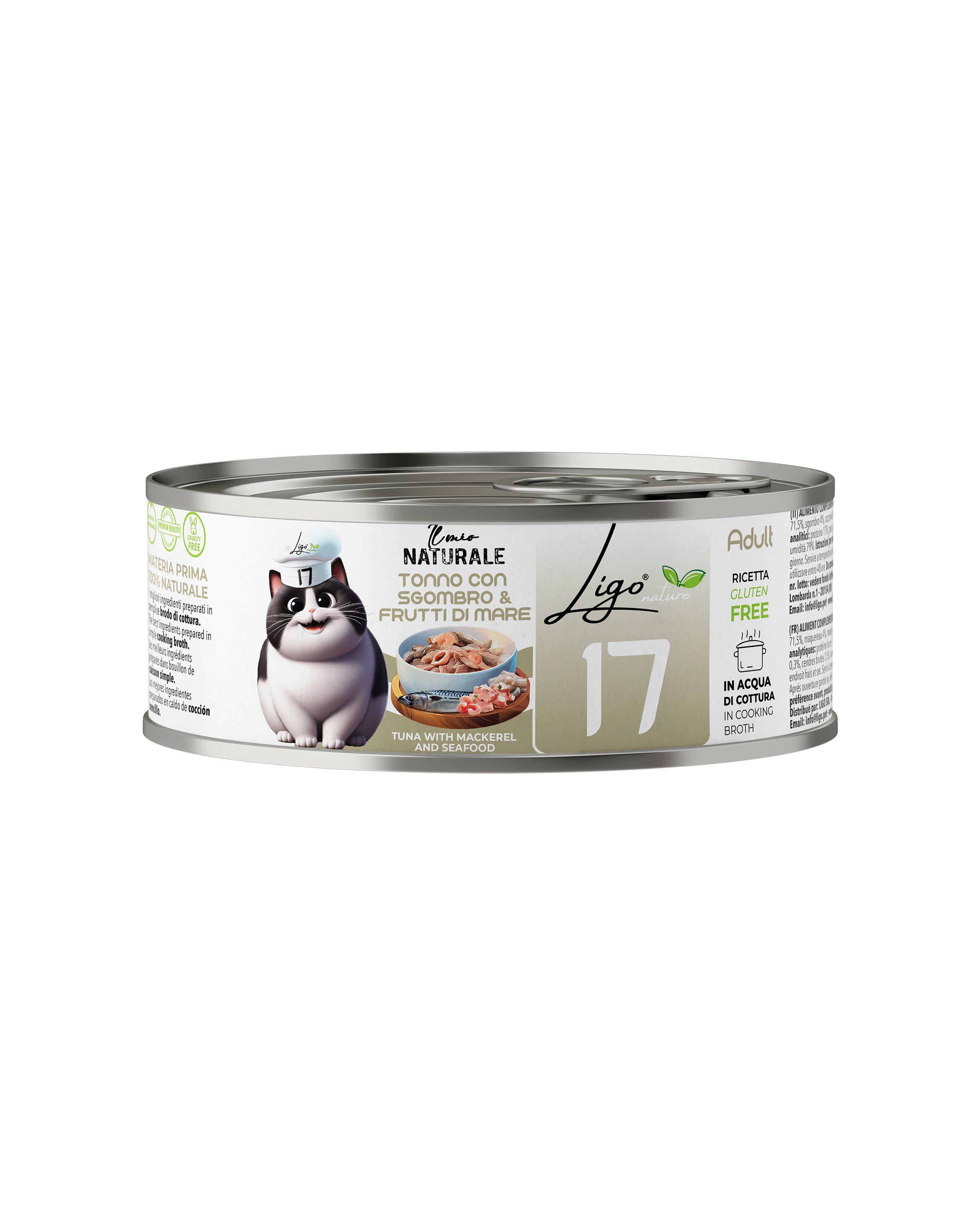 Lattina n. 17 – Tonno con Sgombro & Frutti di Mare Una ricetta dal profumo intenso di mare, che unisce tonno, sgombro e frutti di mare per un pasto ricco di gusto. Cotta in acqua di cottura, è ideale per offrire al gatto una variante saporita e naturale nella sua dieta quotidiana.