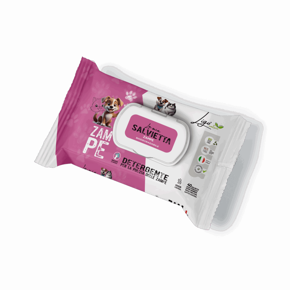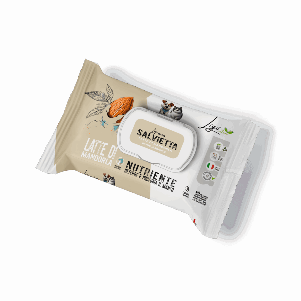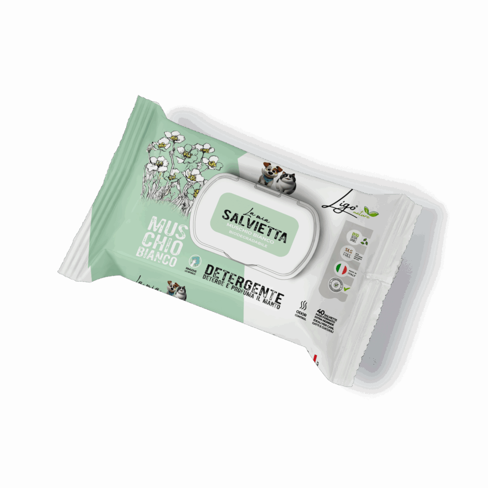 All Ligo Nature wipes contain Aloe Barbadensis (aloe vera) as a base ingredient, known for its moisturising and soothing properties. The formulas respect the natural pH of the pet’s skin and are enriched with functional ingredients such as jojoba oil, chamomile, micellar water and vitamin E. Available in two practical formats: maxi pack of 40 pieces for home use and pocket format of 15 pieces, perfect for walks, trips and outings.