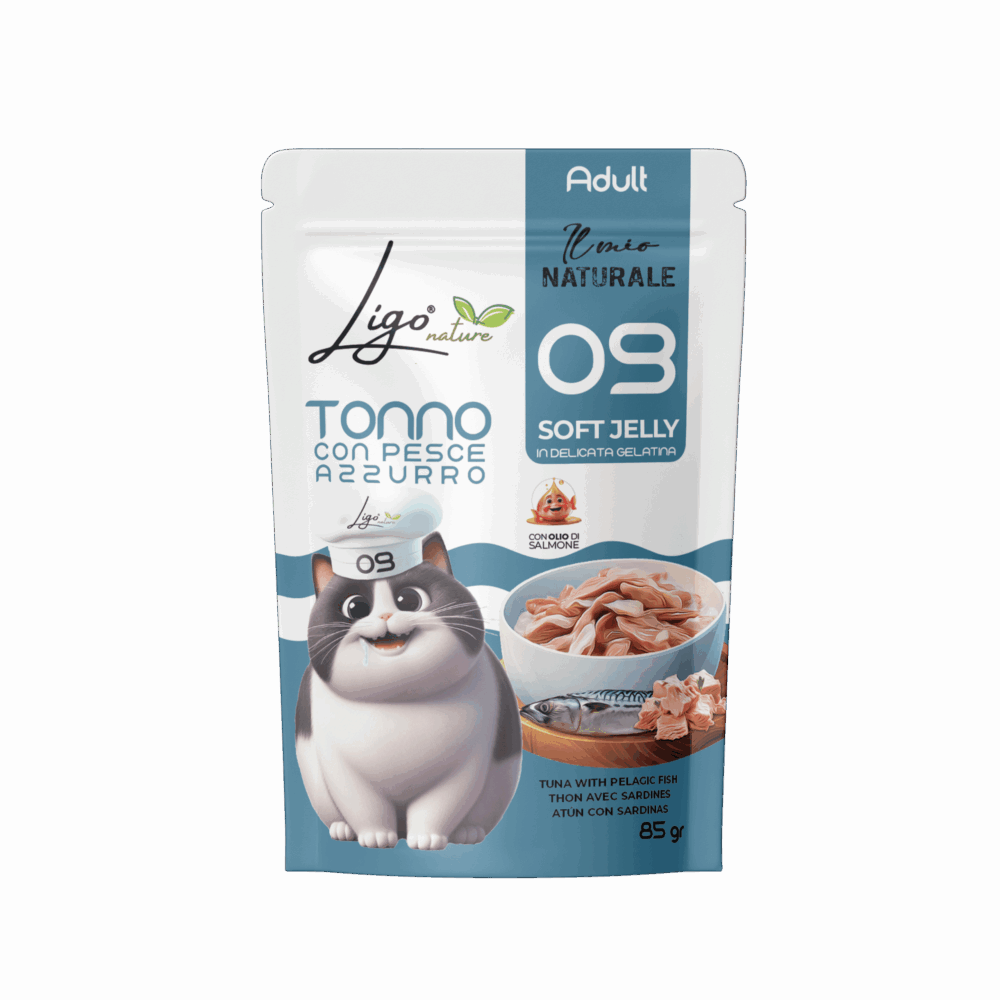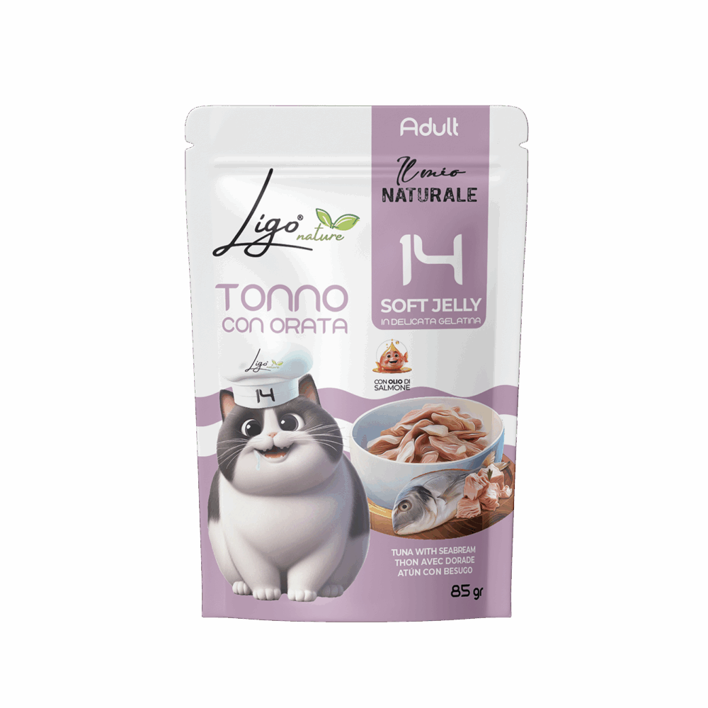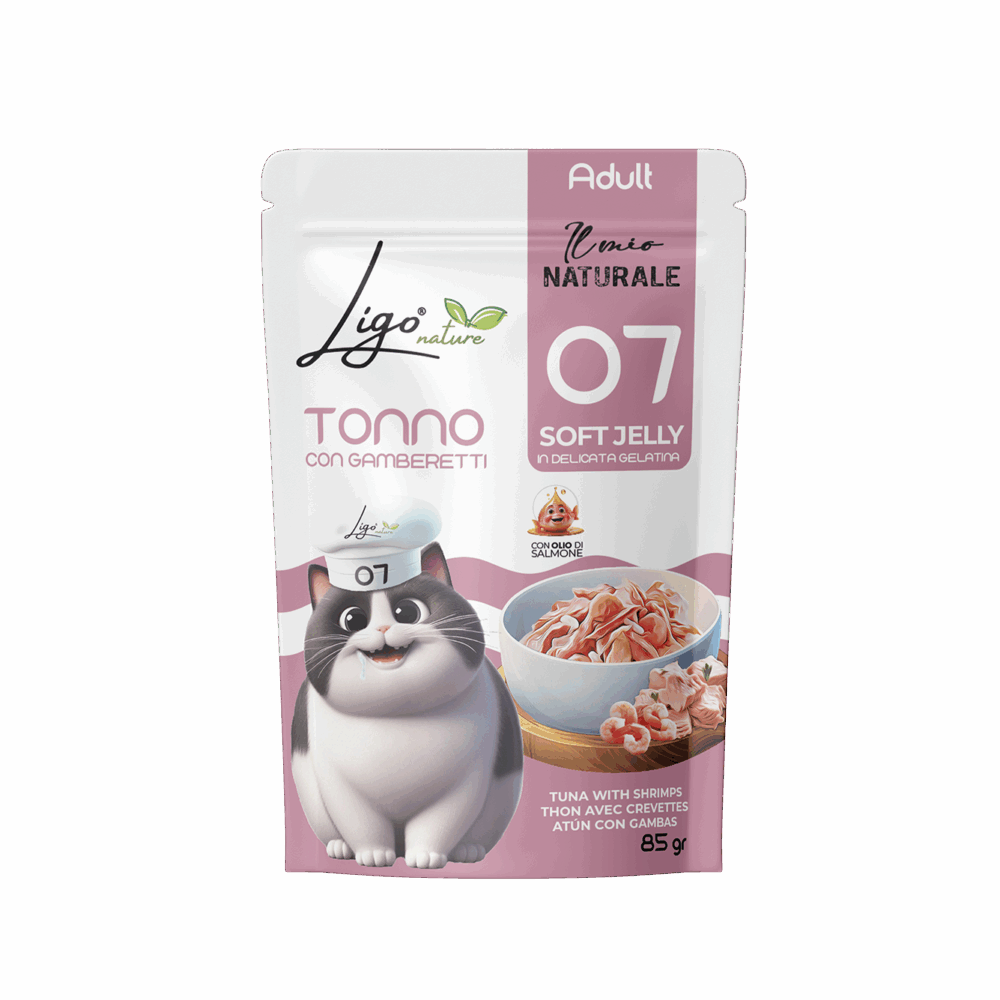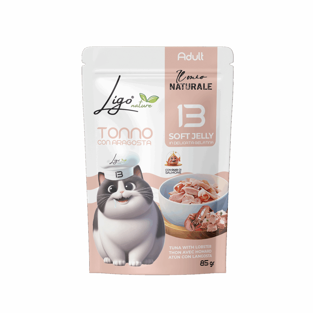 Soft Jelly by Ligo Nature are bites in soft natural jelly for cats, a gourmet line offering tasty and delicate meals. With over 15 recipes based on tuna, chicken, shrimp, lobster and blue fish, every jar is prepared with selected ingredients and cooked in a light jelly that enhances the natural flavour of the ingredients and makes every bite irresistible.