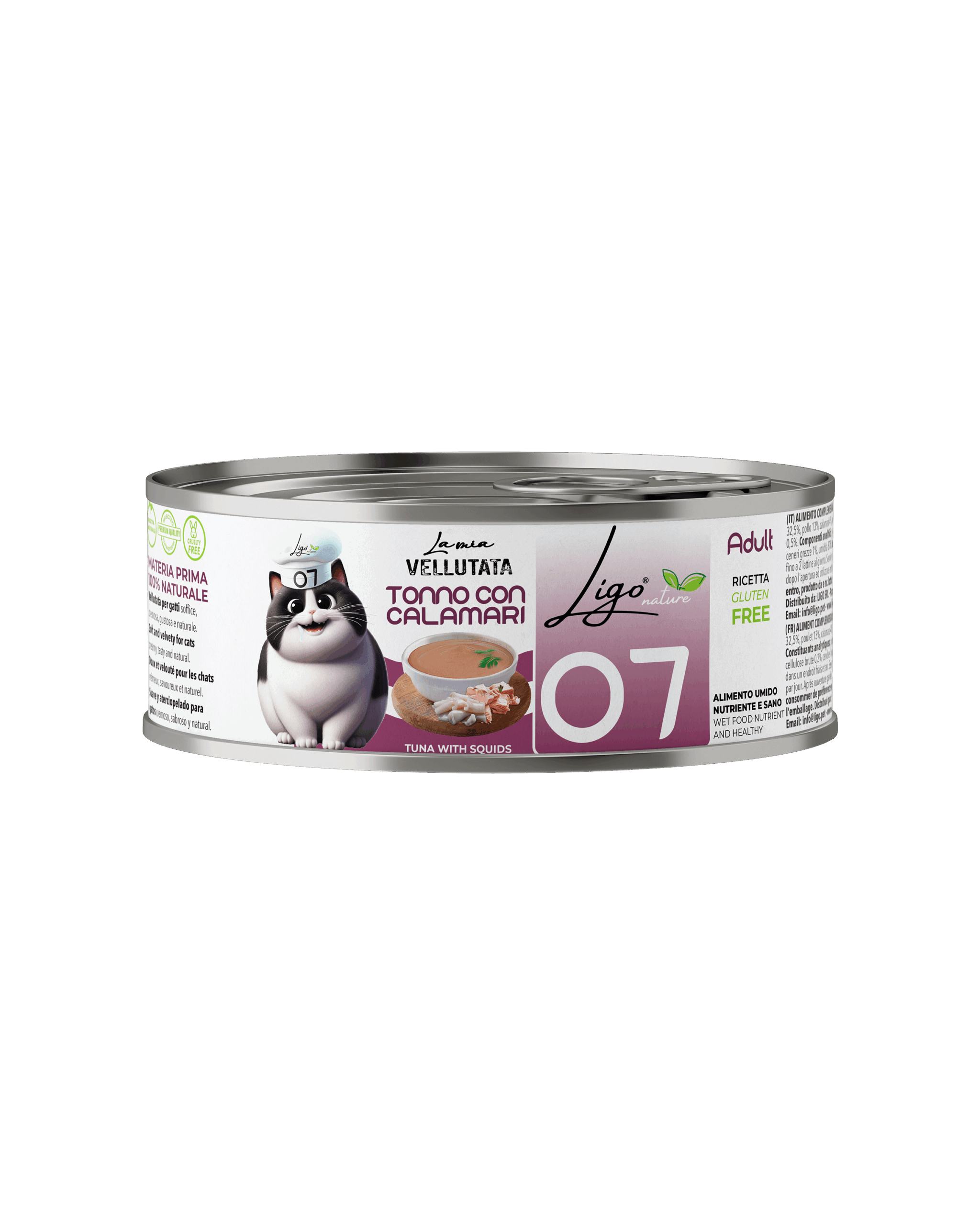 Composizione: tonnetto% 32,5, pollo 13%, calamari 4%, amido di tapioca 2,15%, olio di semi di girasole 0,5%.