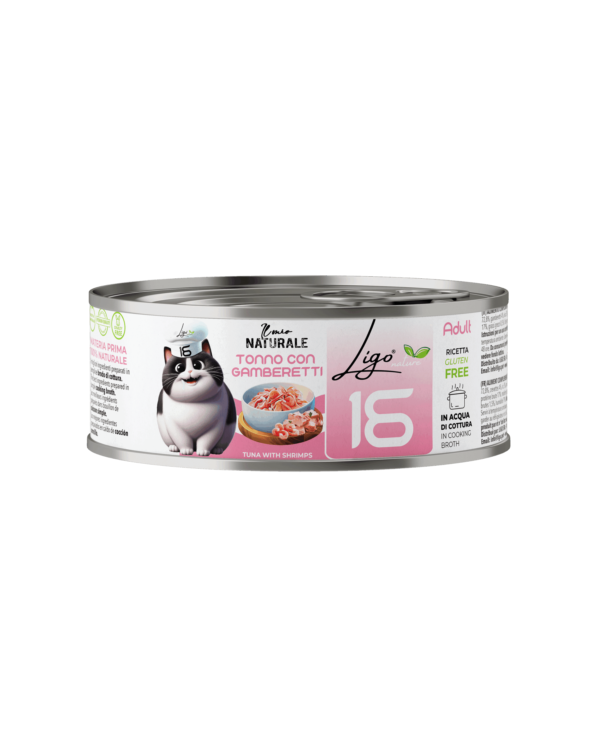 Composizione: tonnetto 72,8%, gamberetti 4%, riso 3%, tapioca 0,58%.